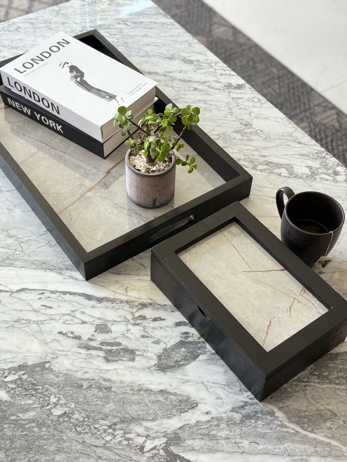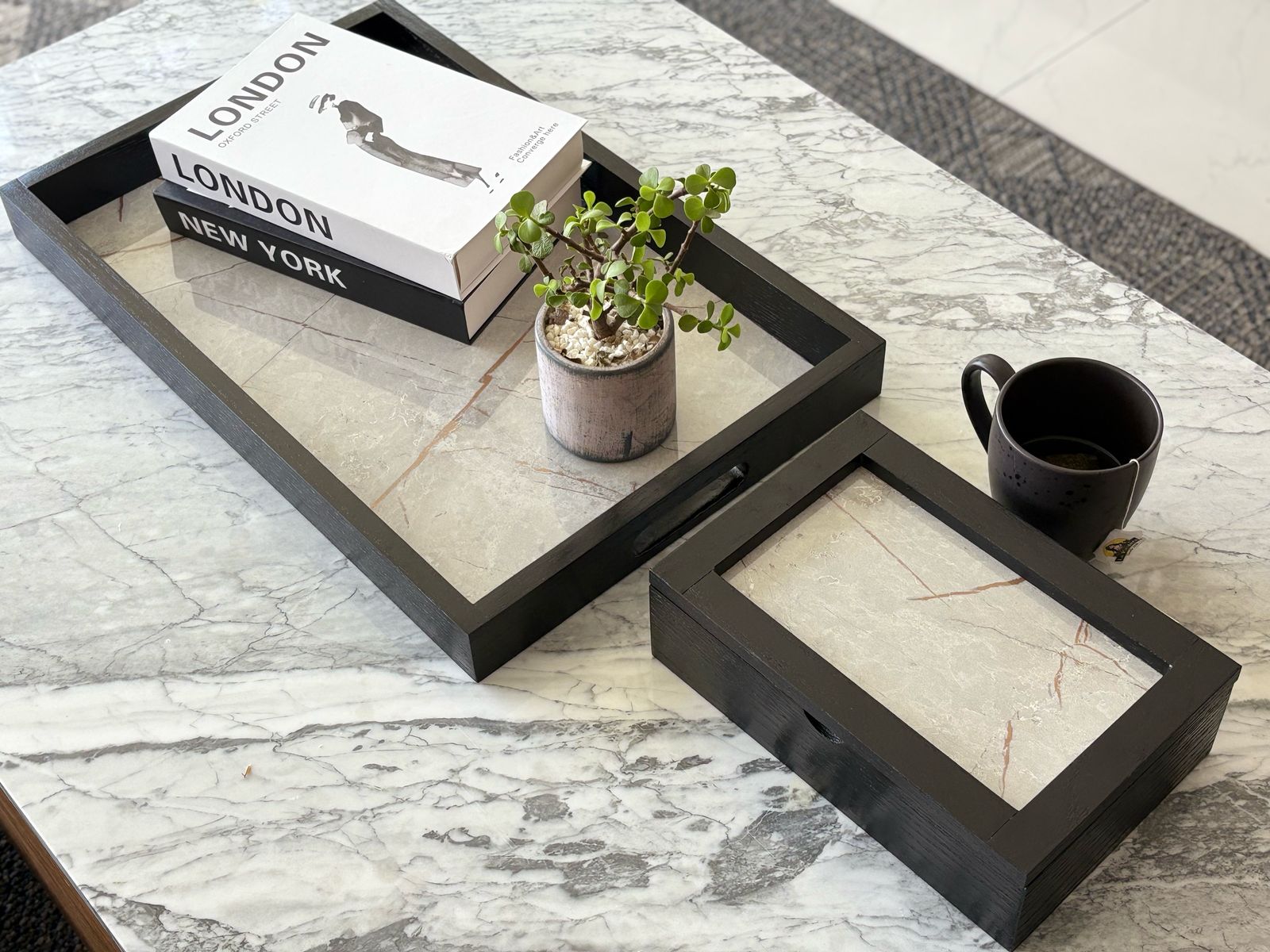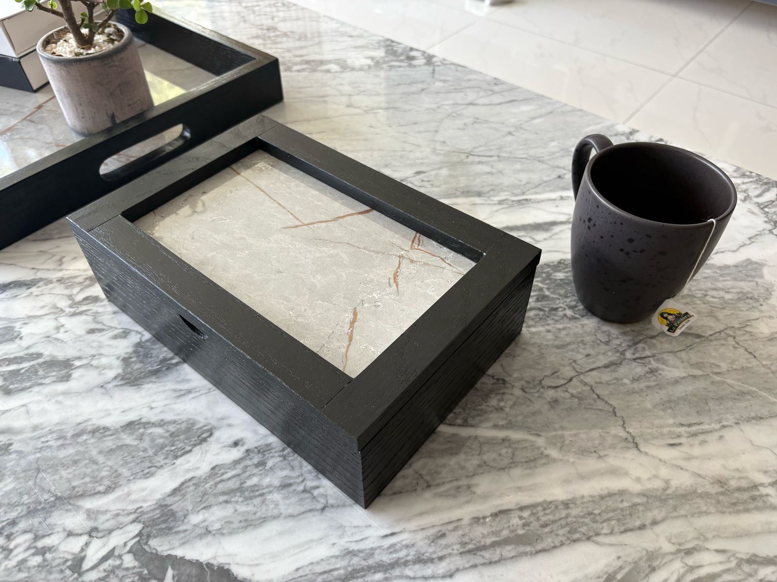Diseñada para quienes disfrutan de los detalles refinados, esta caja de té está elaborada en madera de encino negro, un material noble que aporta calidez y distinción. Su tapa, en melamina gris con delicados destellos dorados, añade un toque sofisticado que la convierte en mucho más que un simple organizador: es una pieza decorativa que realza cualquier espacio.