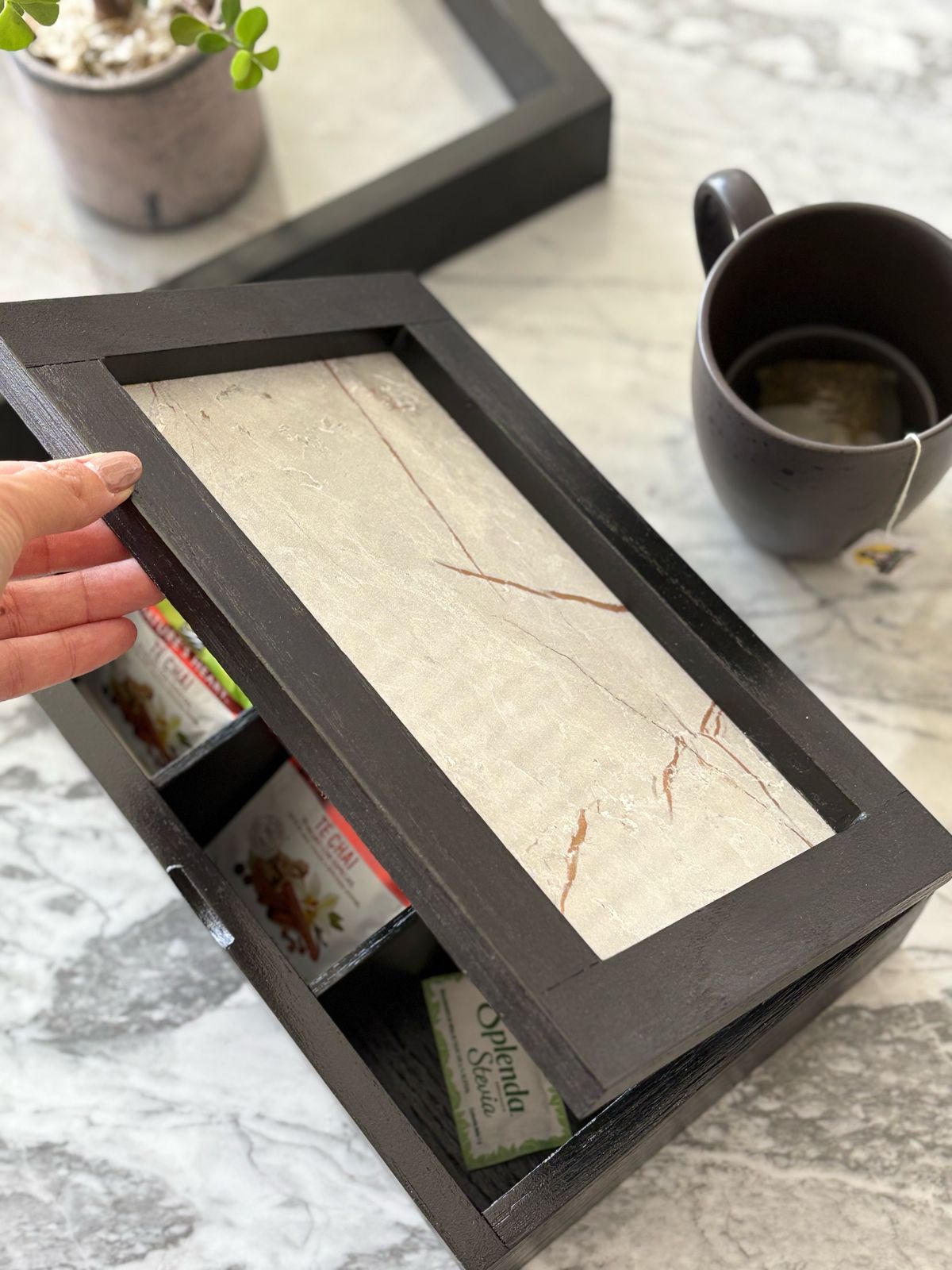 Su interior ofrece el espacio perfecto para resguardar y organizar sobres de té, manteniéndolos siempre a la mano y presentados con elegancia. Ideal para colocar en la cocina, en una barra de café o incluso en la sala, como un detalle que invita a disfrutar de momentos especiales.