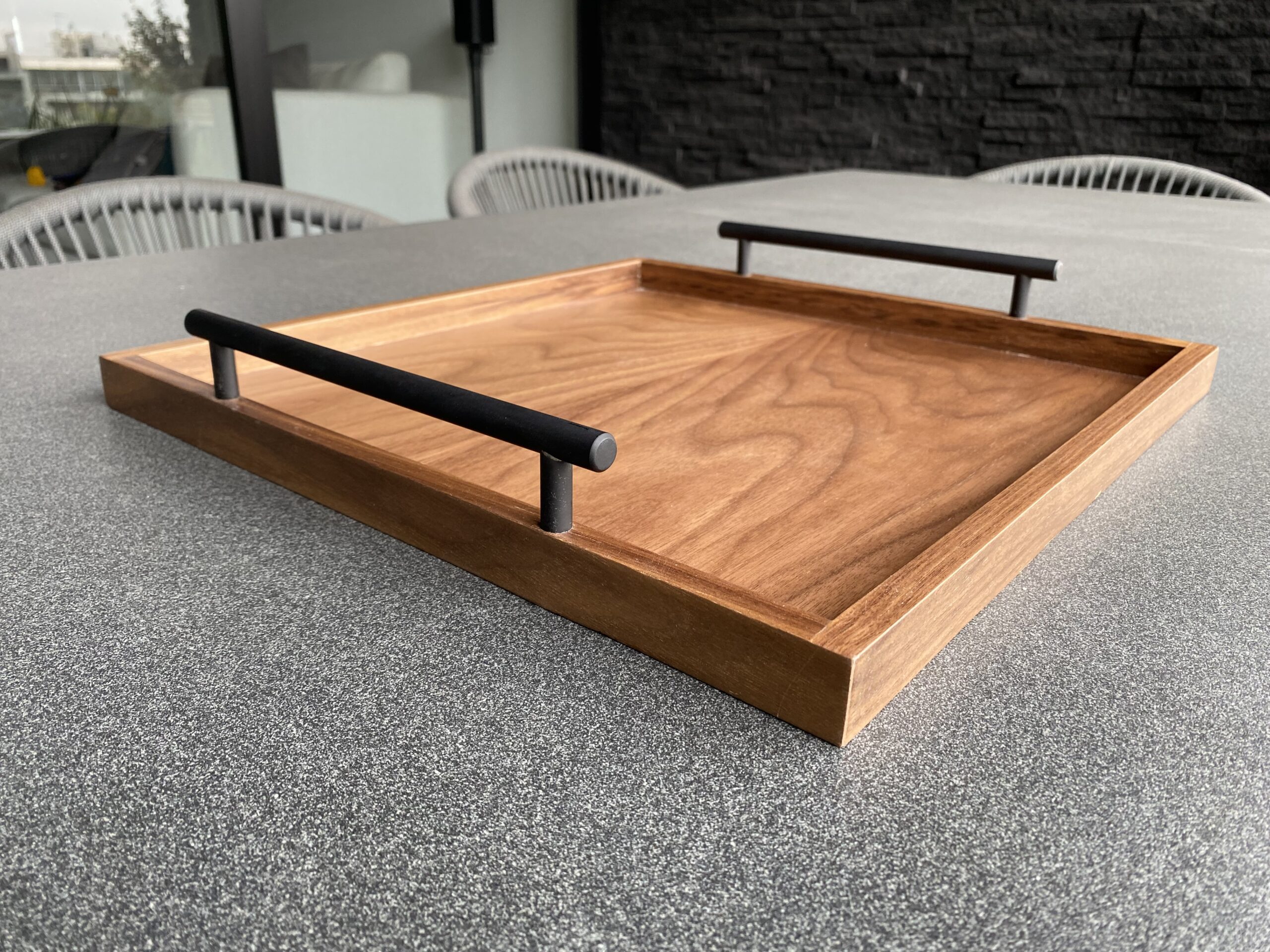 Charola de madera de nogal con manijas de metal.