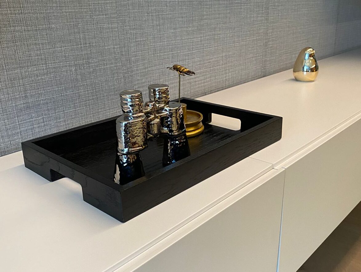Charola de servicio o decoración, chapa natural de madera encino negro con veta.