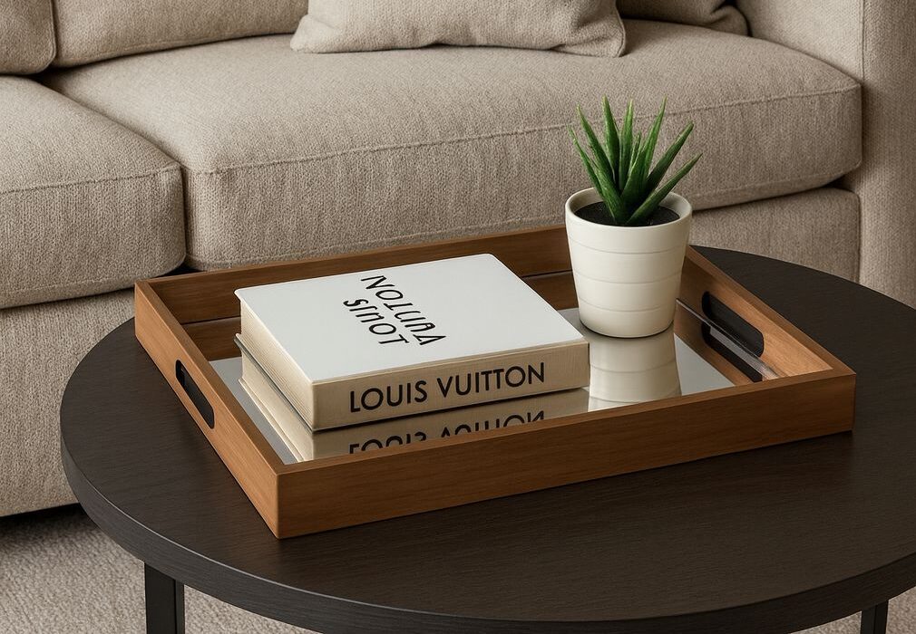 Charola decorativa en madera nogal con fondo de espejo