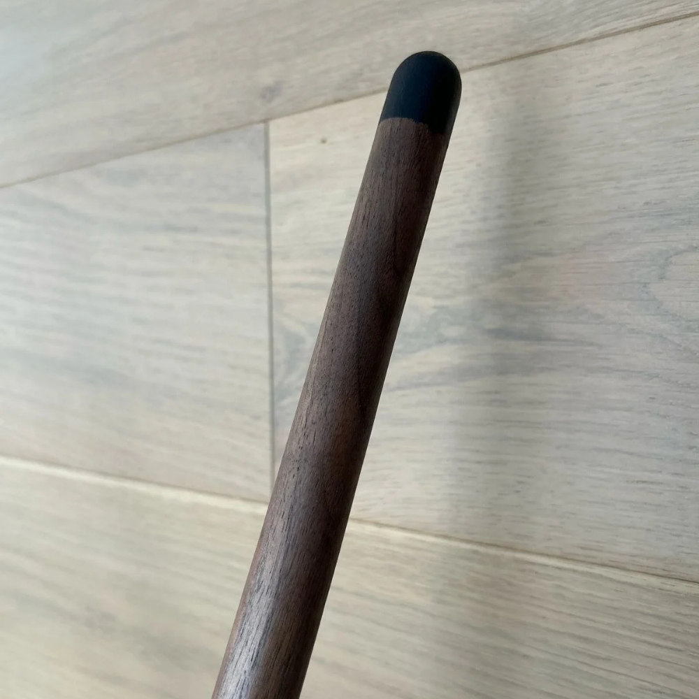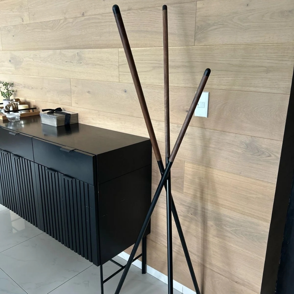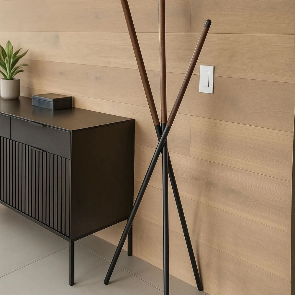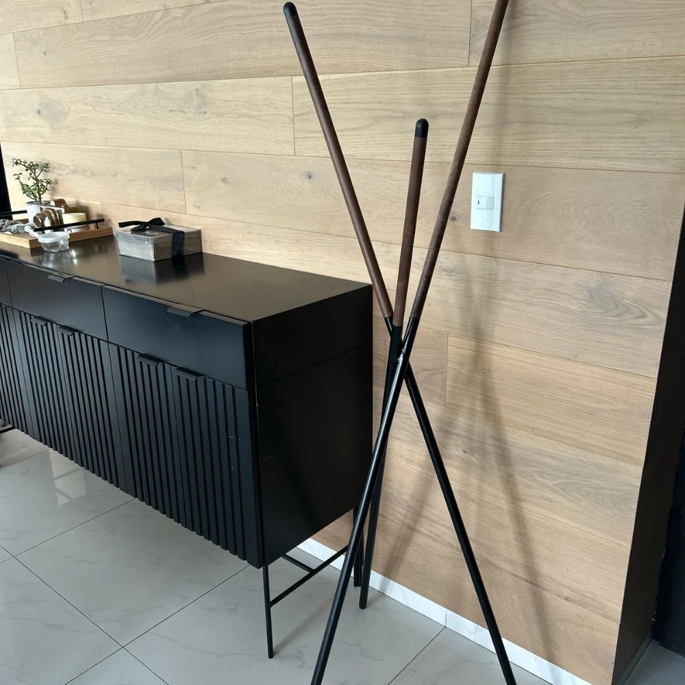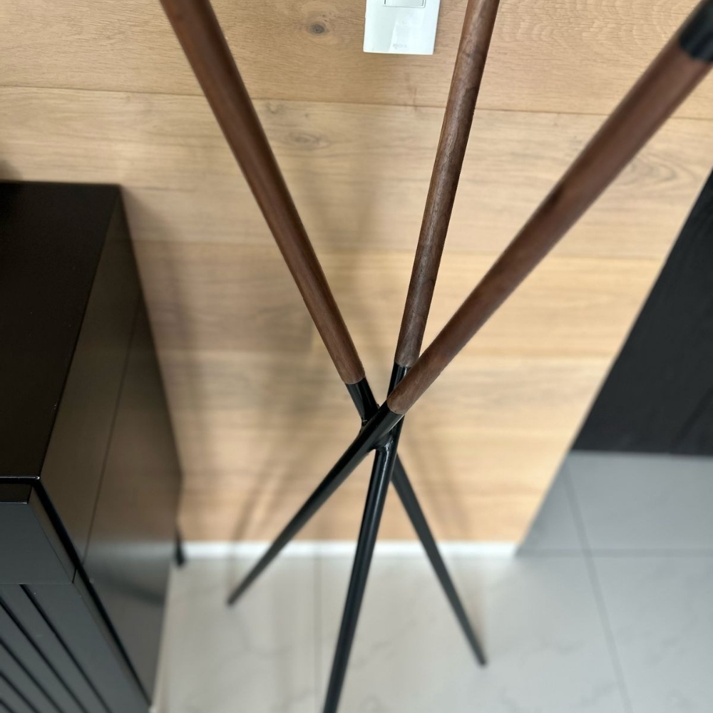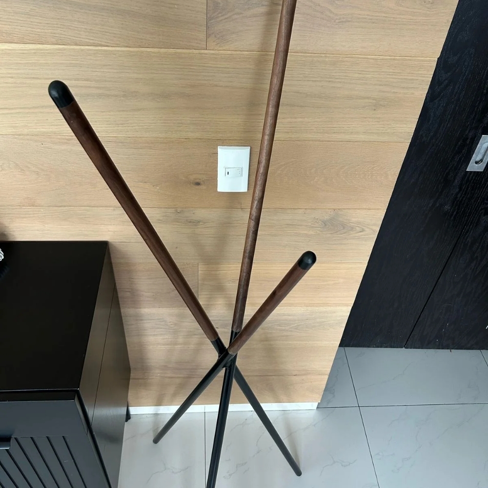 Hermoso perchero de metal negro con madera de nogal.